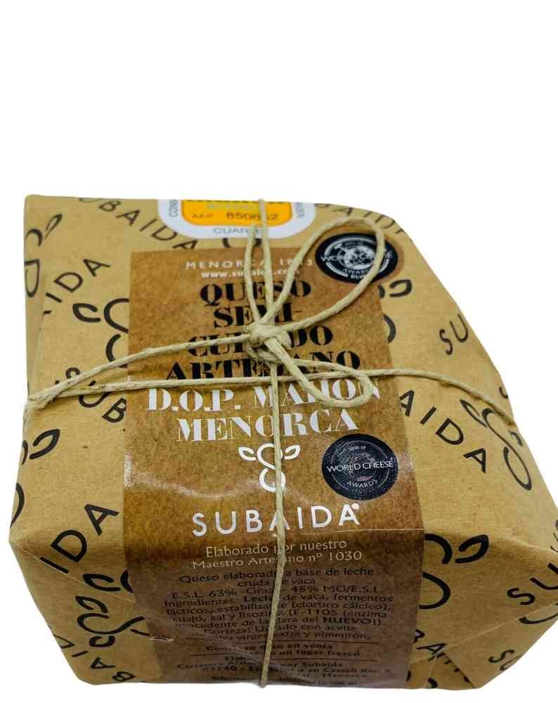 Queso semicurado 1/4 de pieza con Denominación de Origen Mahón-Menorca, elaborado con leche cruda de vacas propias.